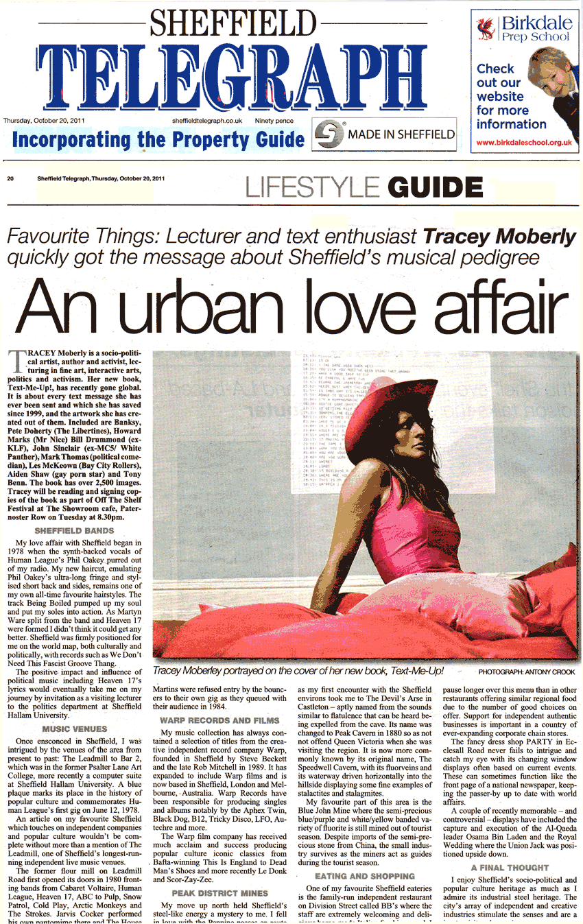 TRACEY Moberly is a socio-political artist, author and activist, lecturing in fine art, interactive arts, politics and activism. Her new book, Text-Me-Up!, has recently gone global. It is about every text message she has ever been sent and which she has saved since 1999, and the artwork she has created out of them. Included are Banksy, Pete Doherty (The Libertines), Howard Marks (MrNice) Bill Drummond (exKLF), John Sinclair (ex-MC5/ White Panther), Mark Thomas (political comedian), Les McKeown (Bay City Rollers), Aiden Shaw (gay porn star) and Tony Benn. The book has over 2,500 images. Tracey will be reading and signing copies of the book as part of Off The Shelf Festival at The Showroom cafe, Paternoster Row on Tuesday at 8.30pm.