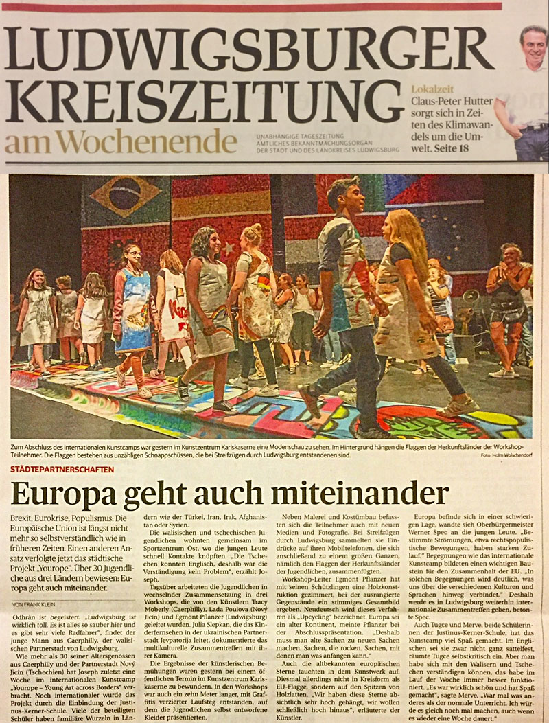 Like more than 30 of his contemporaries from Caerphilly and the partner city Novy Hein (Czech Republic), Joseph spent most of a week at the international "Kunstcamp" "Yourope - Young Art across Borders." The international integration of the Justinus Kerner School Many of the students involved have family roots in countries like Turkey, Iran, Iraq, Afghanistan or Syria.